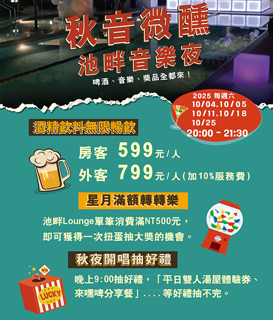 提供「秋音微醺・池畔音樂夜」演唱、優惠及抽獎的活動,讓入住的貴賓感受秋節飯店的歡樂氣氛,同時享有抽大獎同樂的驚喜。