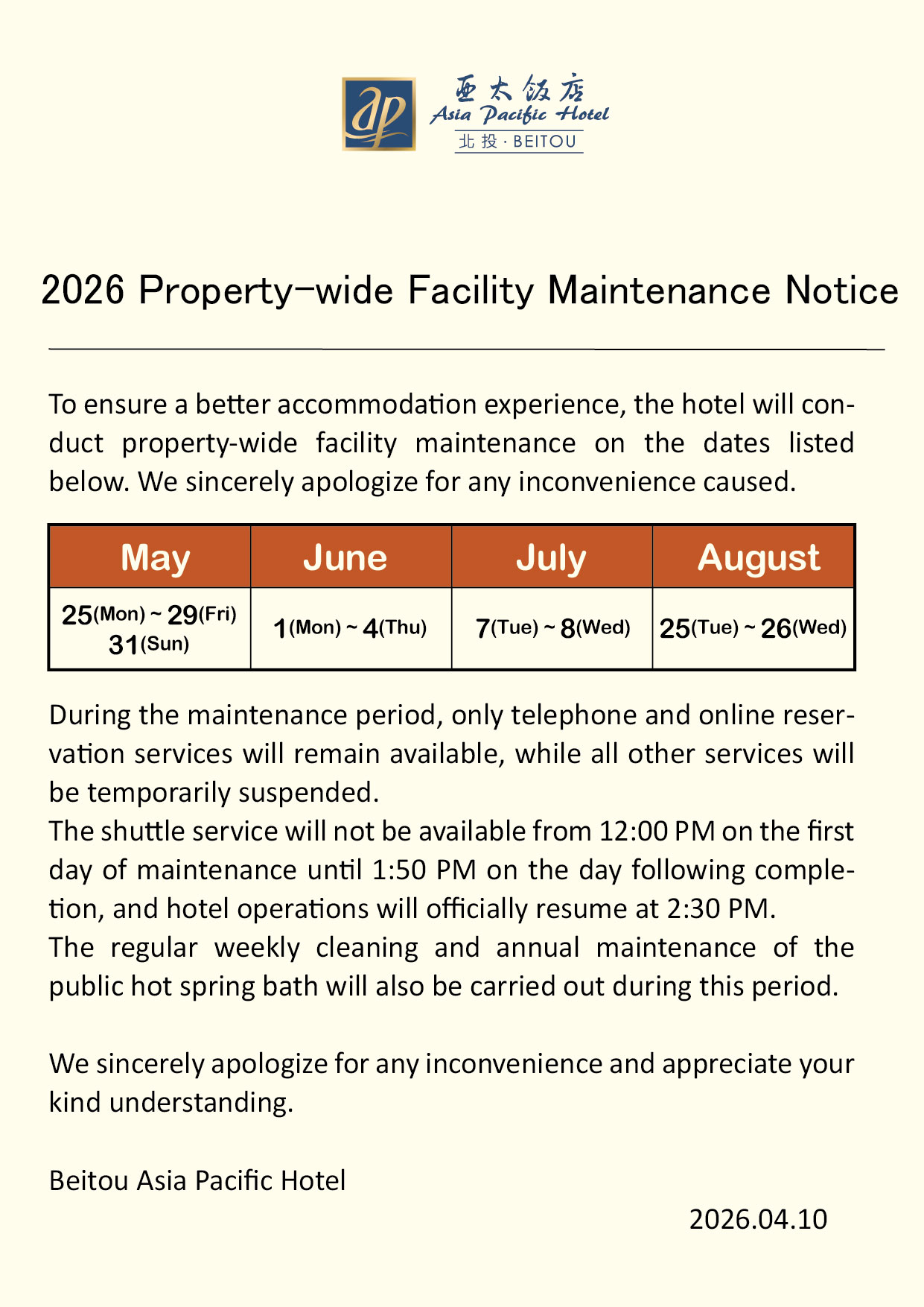 To ensure a better accommodation experience, the hotel will conduct property-wide facility maintenance on the dates listed below. We sincerely apologize for any inconvenience caused.
