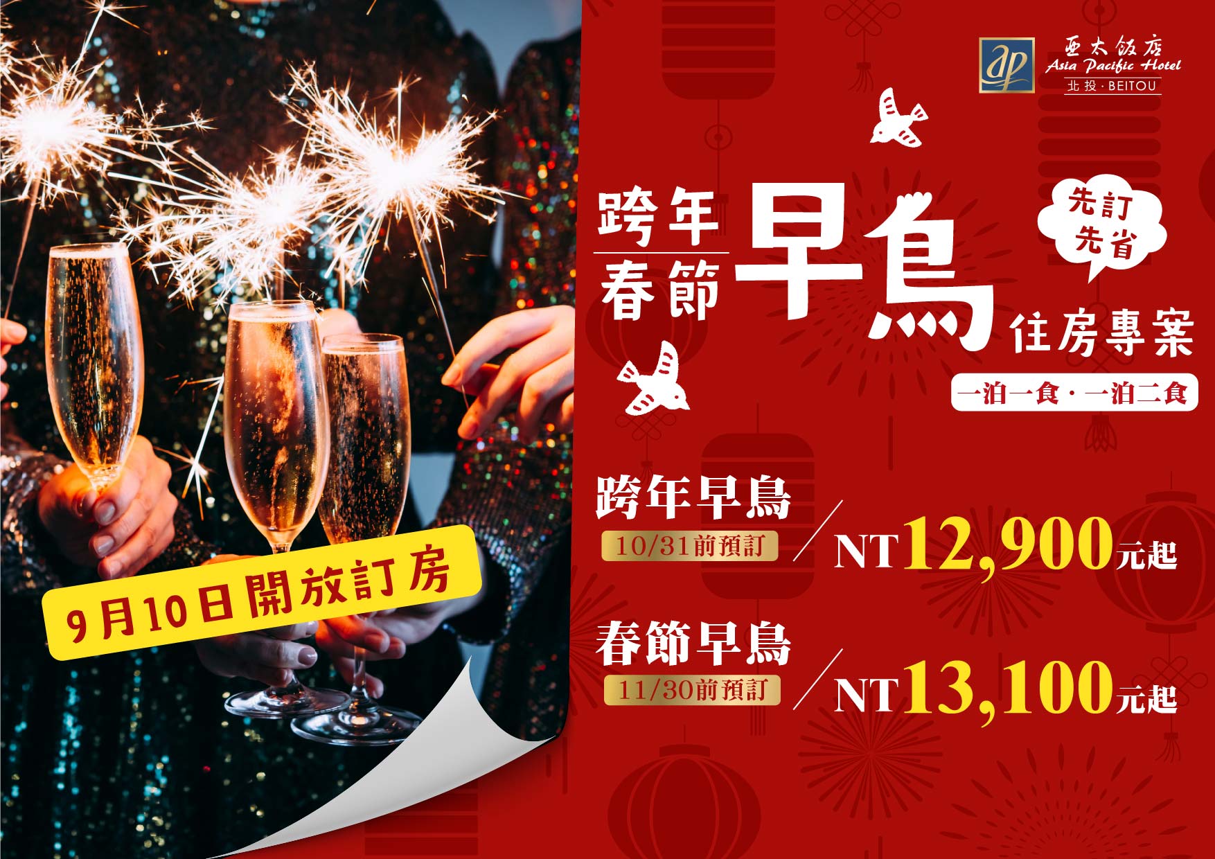 針對提早計畫跨年及春節旅程的旅客,北投亞太飯店特別推出「跨年․春節早鳥」住房優惠專案,提供優惠!