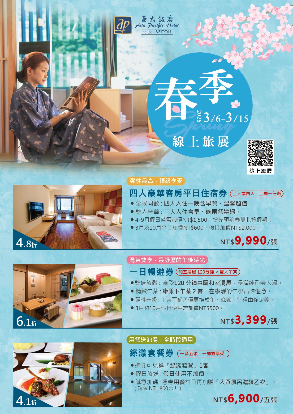 感謝您對北投亞太飯店的支持!2026 年度首場線上旅展將於3月6日至3月15日盛大展開。我們為您精心準備了多款超值票券,無論是家庭出遊、雙人度假或是美食溫泉饗宴,都能在此找到最完美的選擇。