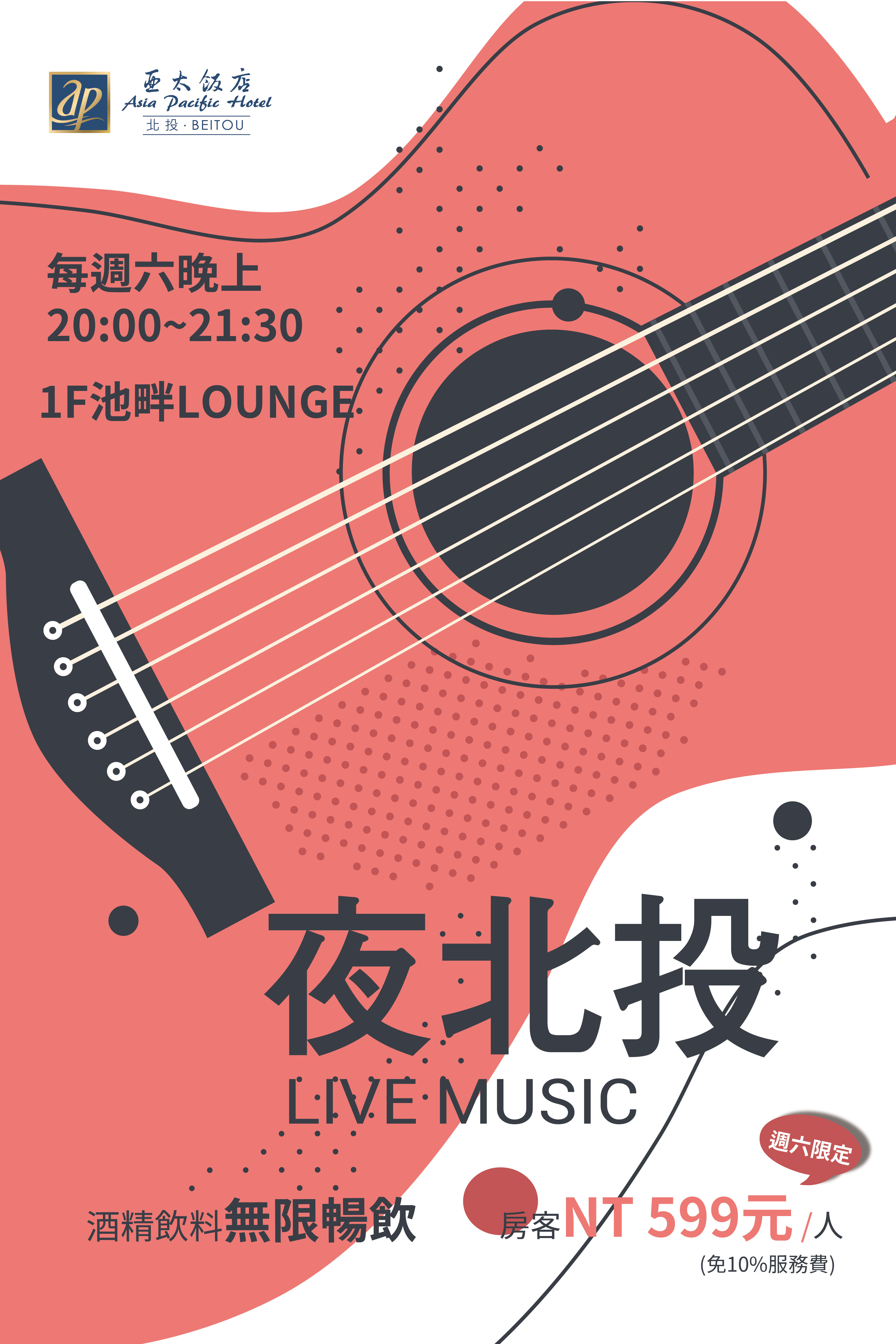 【夜北投 池畔LIVE MUSIC】 T.G.I.F忙碌的一週終於結束了,讓音樂美酒療癒你的心靈,陪您度過美好的夜晚。 After a busy week, let music and wine heal your soul, and accompany you through a wonderful evening. 每週六 晚上8:00-9:30 我們池畔不見不散
