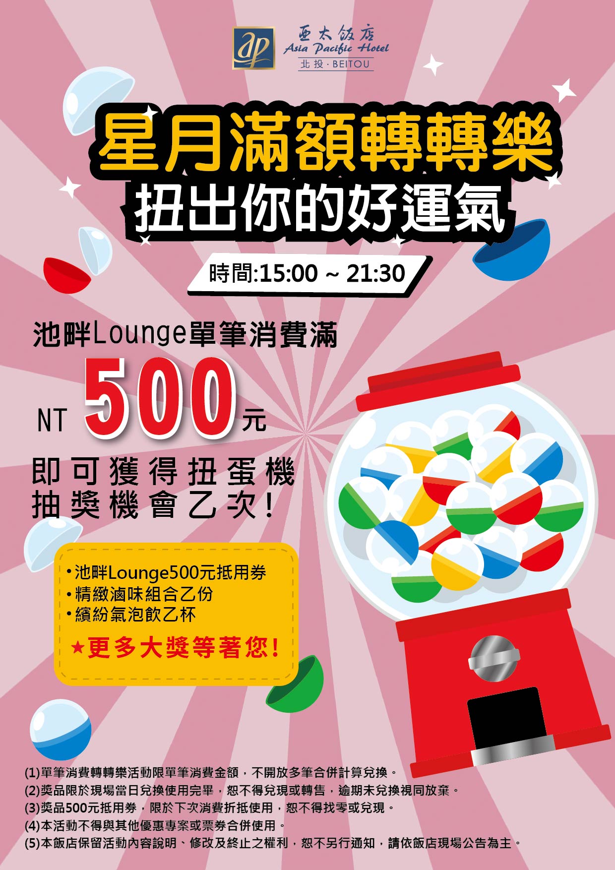 (1)活動期間內,貴賓在池畔Lounge單筆消費滿NT500元,即可獲得一次轉輪抽大獎的機會。