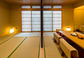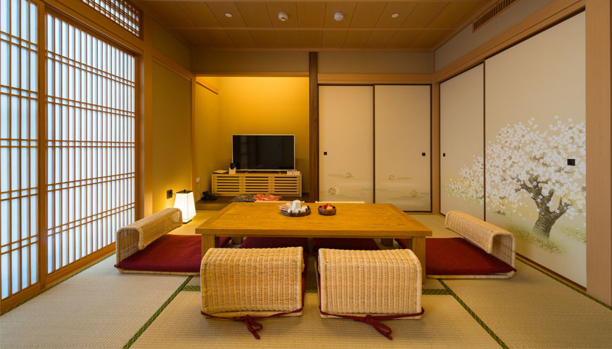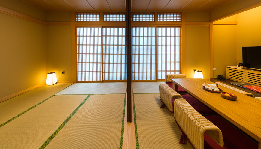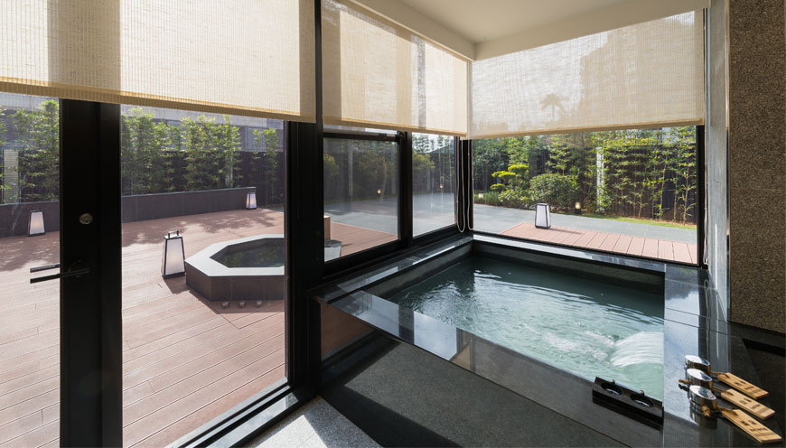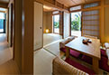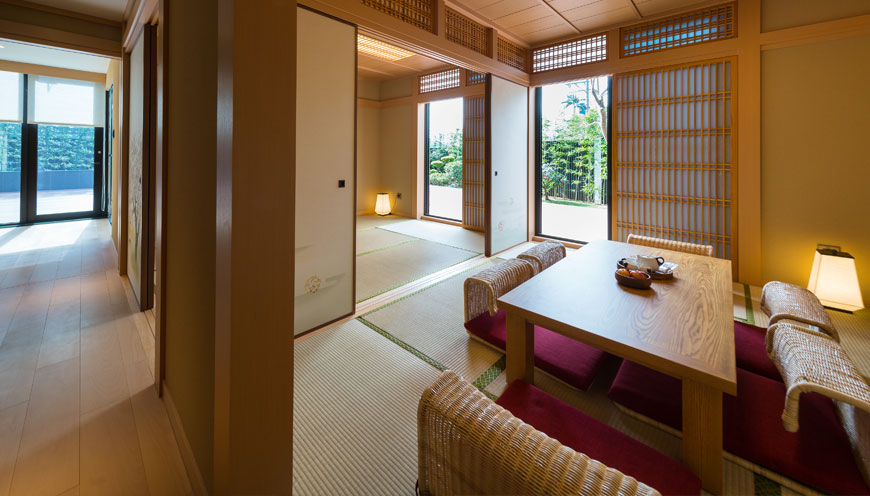 4名様用の最上級の和式禅風畳スイートルームです。屋外には緑に囲まれたテラスエリアがあり、独立式の八角露天風呂が設けられ、太陽の光が降り注ぐ光景の中、独立式の温泉風呂で心身を洗い流してリラックスできます。のんびりとした優雅な雰囲気で、最も心地よい日本の住まいの風情を体験できます。
