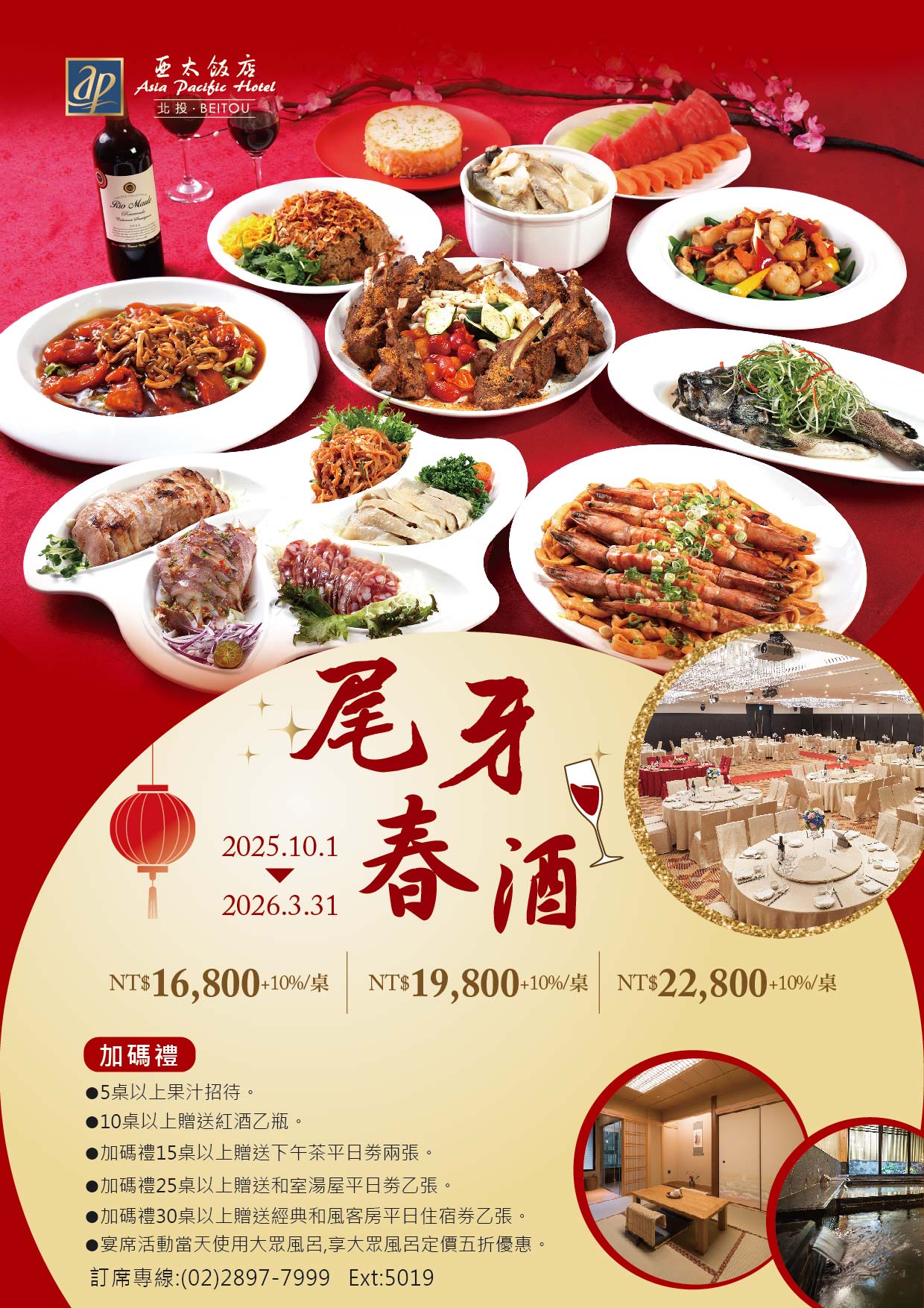 北投亞太飯店為您精心準備澎湃桌宴,豐盛佳餚、舒適場地,讓公司聚餐更添喜氣!